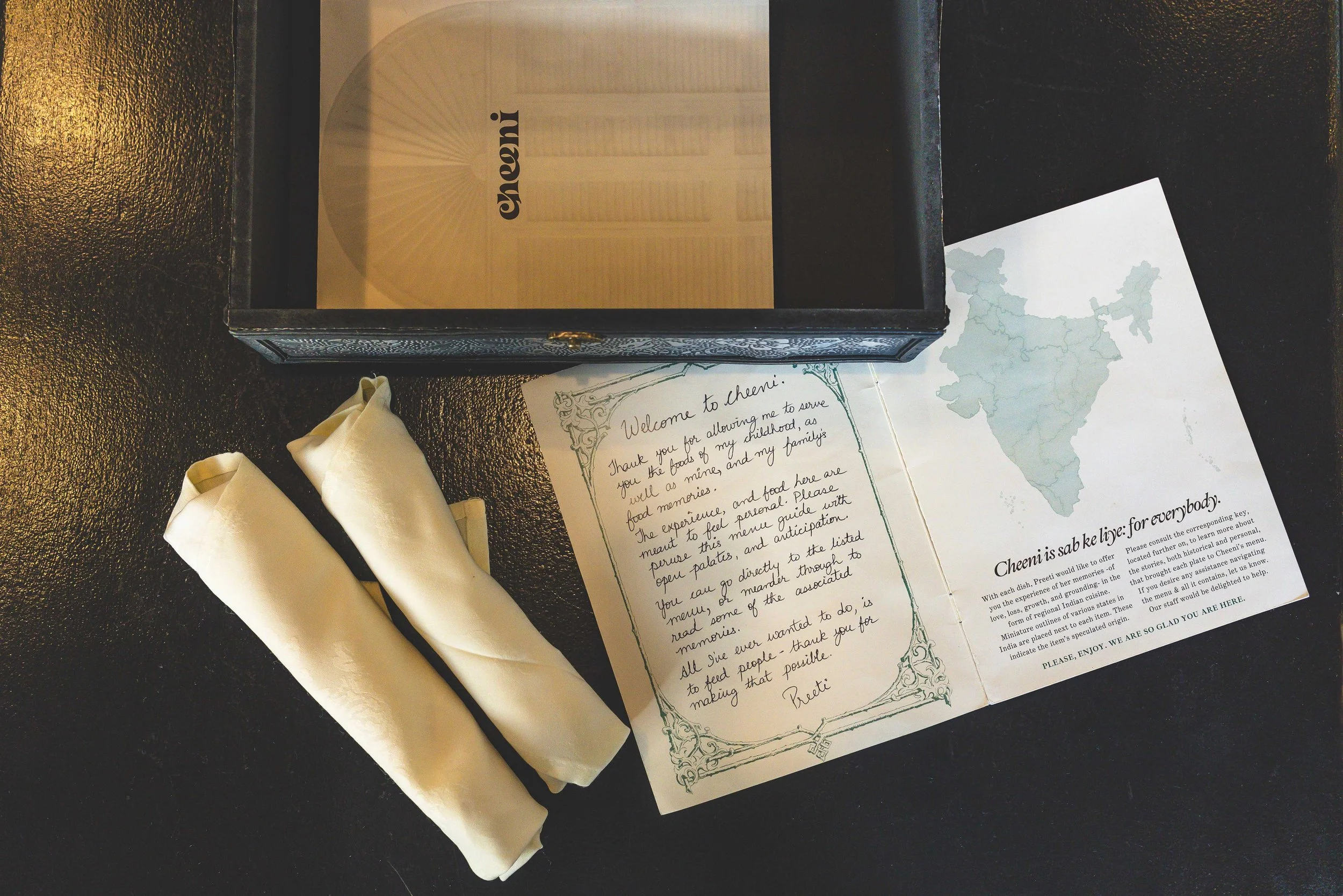 Cheeni means “sugar”—a nod to Chef Preeti Waas, owner, mastermind, chief tasting operator, the force behind Cheeni—and is not actually the name of anyone within our restaurant. Preeti named our restaurant Cheeni after her popular street-style kiosk concept, now closed, which was born of her love of baking.